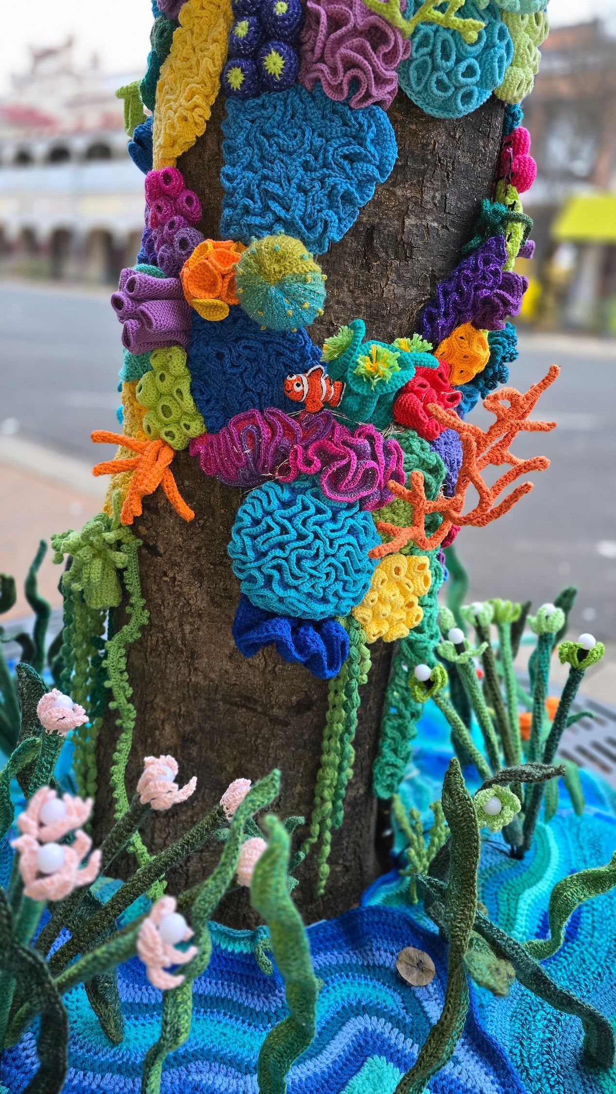 Jumpers & Jazz in July yarn bombed Tree Exhibition