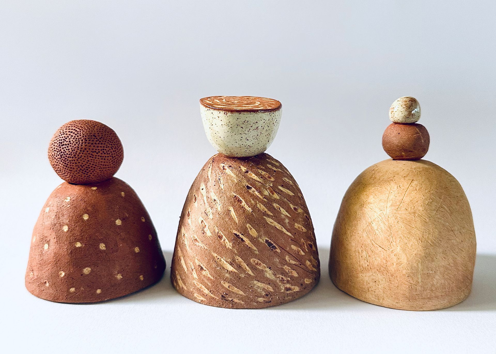Image: Vicki Grima, Lidded Vessel 1, 2, 3, 2022 Eagles Close, Red Retreat and Hillside clays, Display: 10 x 21 x 7.5cm, Courtesy of the artist.